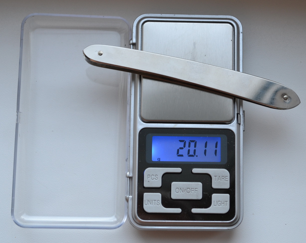 Ручка кифы в пределах 20 ти грамм. Для примера, полотно 6/8 Бенгалл в два раза больше. Добавлено спустя 35 минут 46 секунд: А ручка от медицинской Вачи весит еще больше.