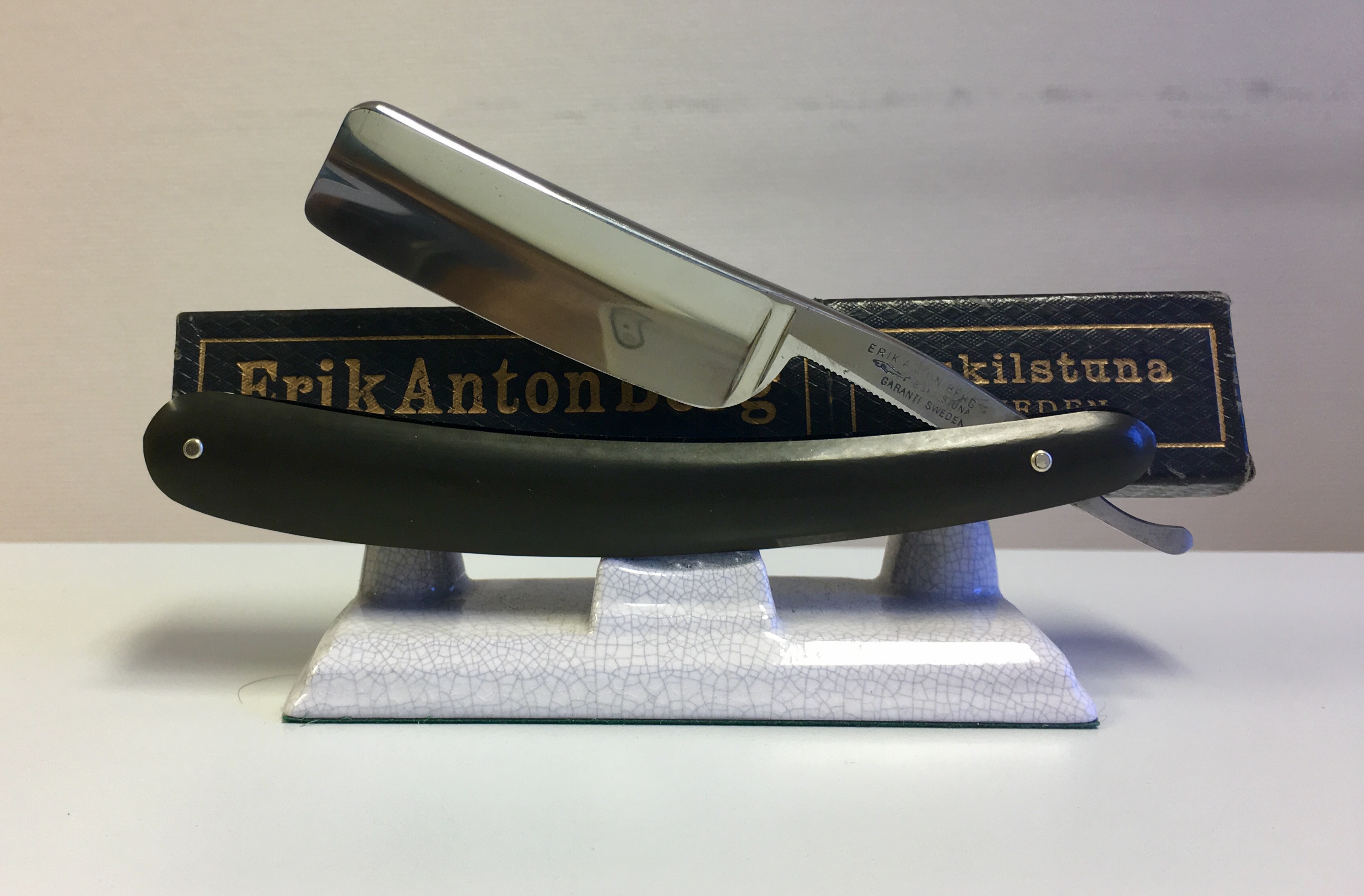 уралец: Что за производитель Erik Anton Berg? Предложили старую бритву от него,ручка ,похоже, неродная ,но само лезвие в очень хорошем состоянии, без всяких следов ржавчины, но и следов предпродажной подготовки нет, лезвие темное. На лезвии ряд (Штук восемь) золотых медалей и четкое клеймо рыбы,видимо акулы. Ширина лезвия ,скорее всего, 6(8 дюйма Может кто подсказать. что это зв бритвы, то в поиске не нашел?