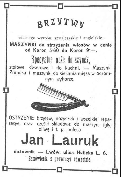 Re: JAN LAURUK ЛьвовИз черенка старой лопаты. А гвоздей там нет - только шляпки. А вообще - новое это хорошо забытое старое: http://www.britva.ru/forum/viewtopic.php?p=61884#p61884" onclick="window.open(this.href);return false; Добавлено спустя 16 минут 49 секунд: Przedwojenny przyrząd Lwów - Jan Lauruk "Un plus ultra", mosiężny, dł. 14cm http://archiwumallegro.com.pl/przedwoje ... 74208.html" onclick="window.open(this.href);return false; Может тут есть чё? http://www.sbc.org.pl/dlibra/plain-content?id=12498" onclick="window.open(this.href);return false; Ремонт опасных бритв, звонить с 11-00 до 23-00, +79267729357, (whats app, telegram, VK), спросить Олега.