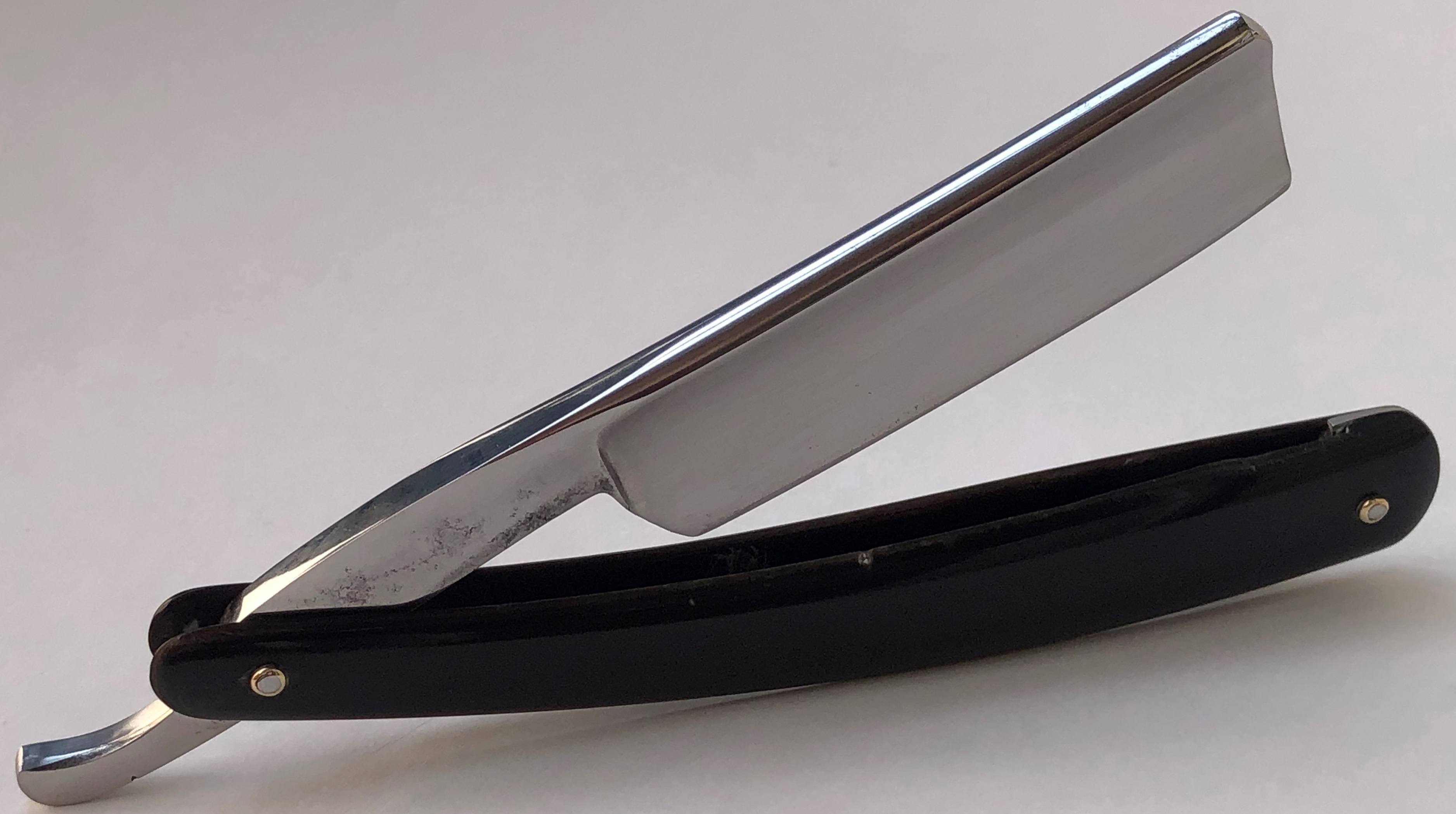 Сама по себе бритва довольно крупного размера. На моём экземпляре -24.0 мм ширина полотна(обушок-6.5 мм), но я думаю что было и больше. Касаемо скошенного носика, то думается мне, что в оригинале был испанский носик(как на фото),но по каким то причинам был спилен, что совершенно не испортило внешний вид клинка. Родная роговая оправа. Короче, бритву восстановил, так что послужит еще.. :)