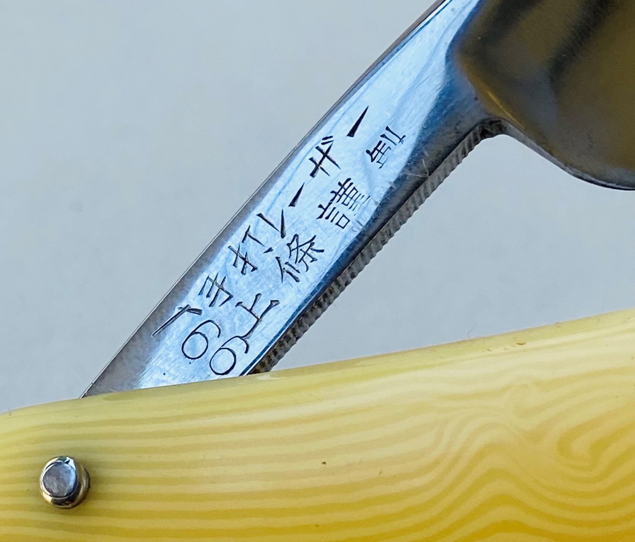 Не часто можно увидеть японскую бритву, по форме лезвия очень напоминающую английскую классику,рубежа 19-20-х веков.Мое мнение, что Камиджо Юкио брал за основу именно английские бритвы того периода, как наиболее удобные в обращении.