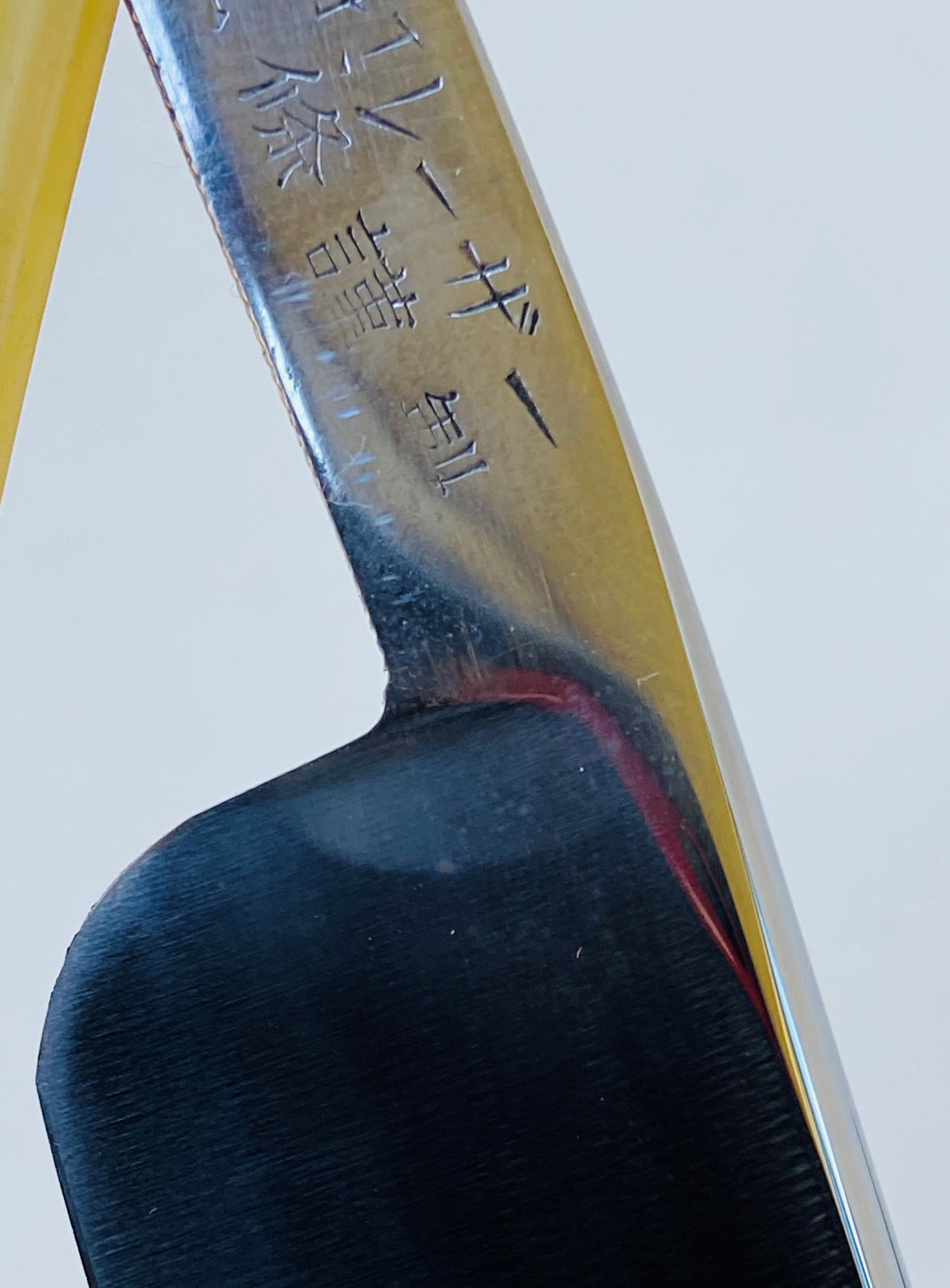 Что интересно, в этот раз бритва , под номером 586,попалась совсем непользованная. Достаточно мощный клин, 21.5 мм шириной и значительным весом.Все искал проявления линии перехода от вертикальной закалки, в районе пятки, но так и не нашел. По всей видимости клинок калили, опустив его в масло по самый эрль, что можно увидеть на фото со стрелкой. Вот там то я и обнаружил этот "фирменный" штрих от Камиджо Юкио.Немного полирнул вручную полотно, ничего не разбирая и все..