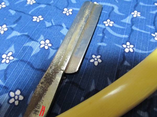 Попались пара бритв Хакамады, но похоже однофамилец.. Продавец уточняет плохоразличимое клеймо на эрле : 袴田芳太郎作 (Hakamada Yoshitarō-saku ) 袴田 (Hakamada) Фамилия 芳太郎 (Yoshitarō)-Имя 作 (saku) - "изготовлена, произведена" Челябинские мужики настолько суровы, что правят бритву не на ремне, а на роже.