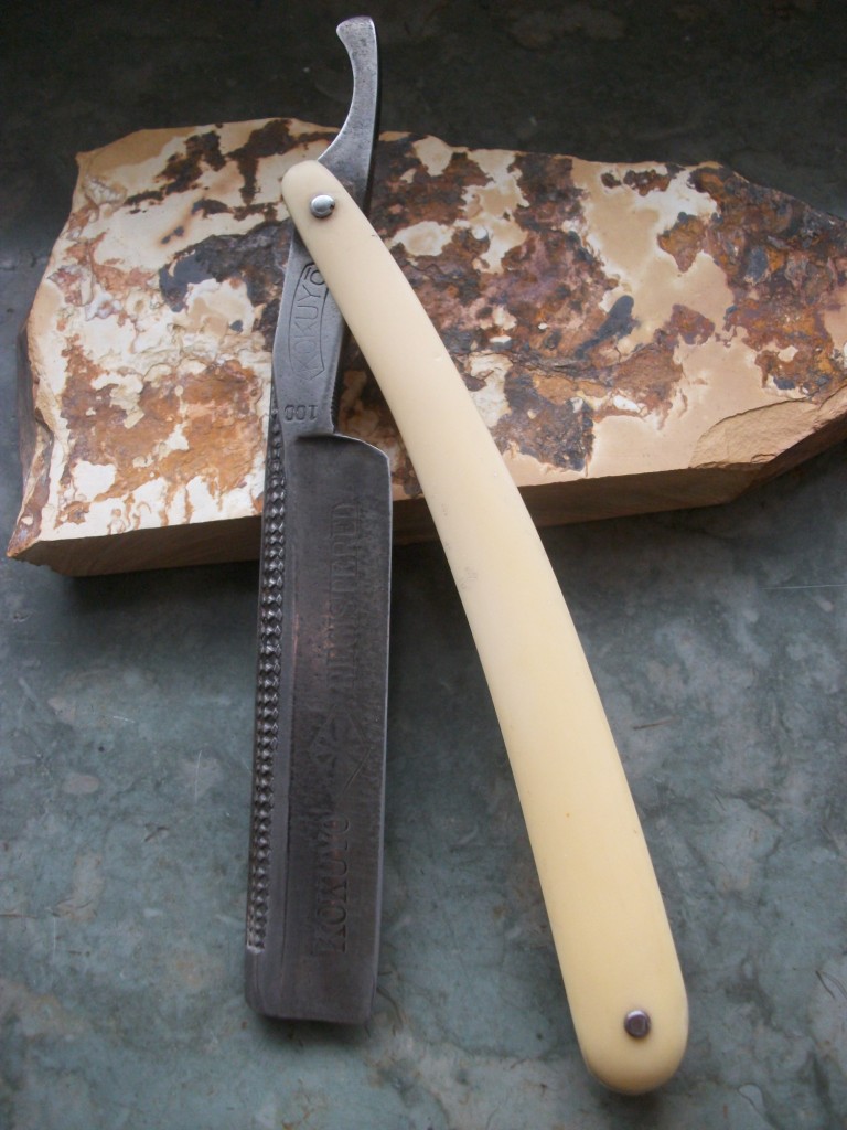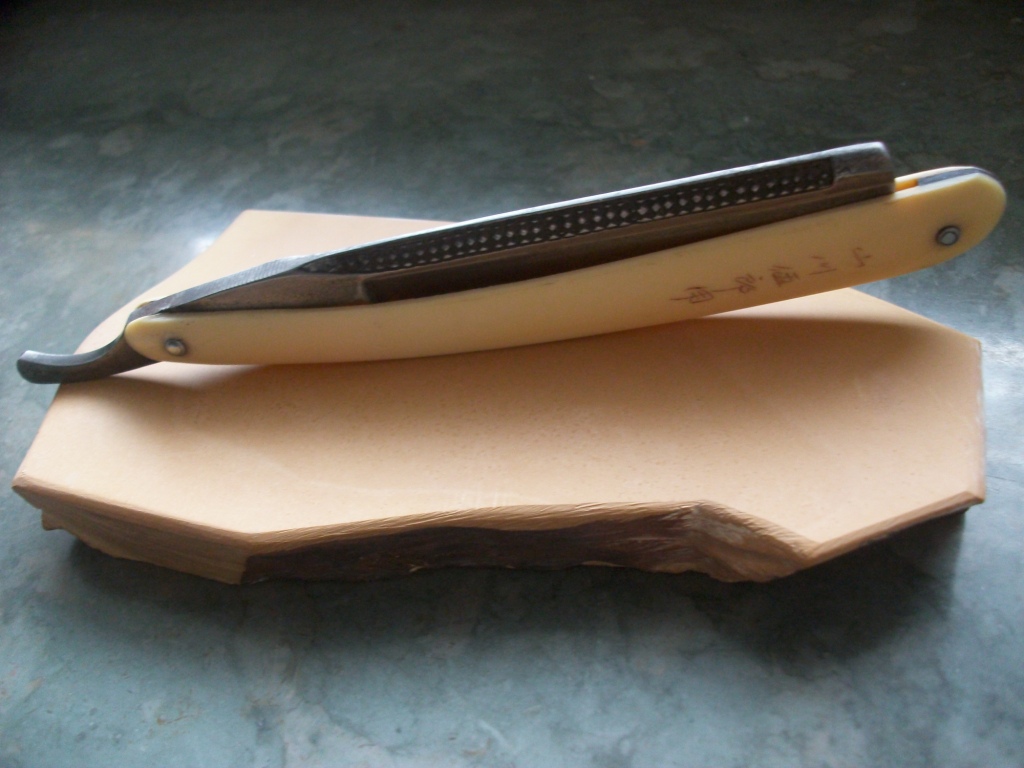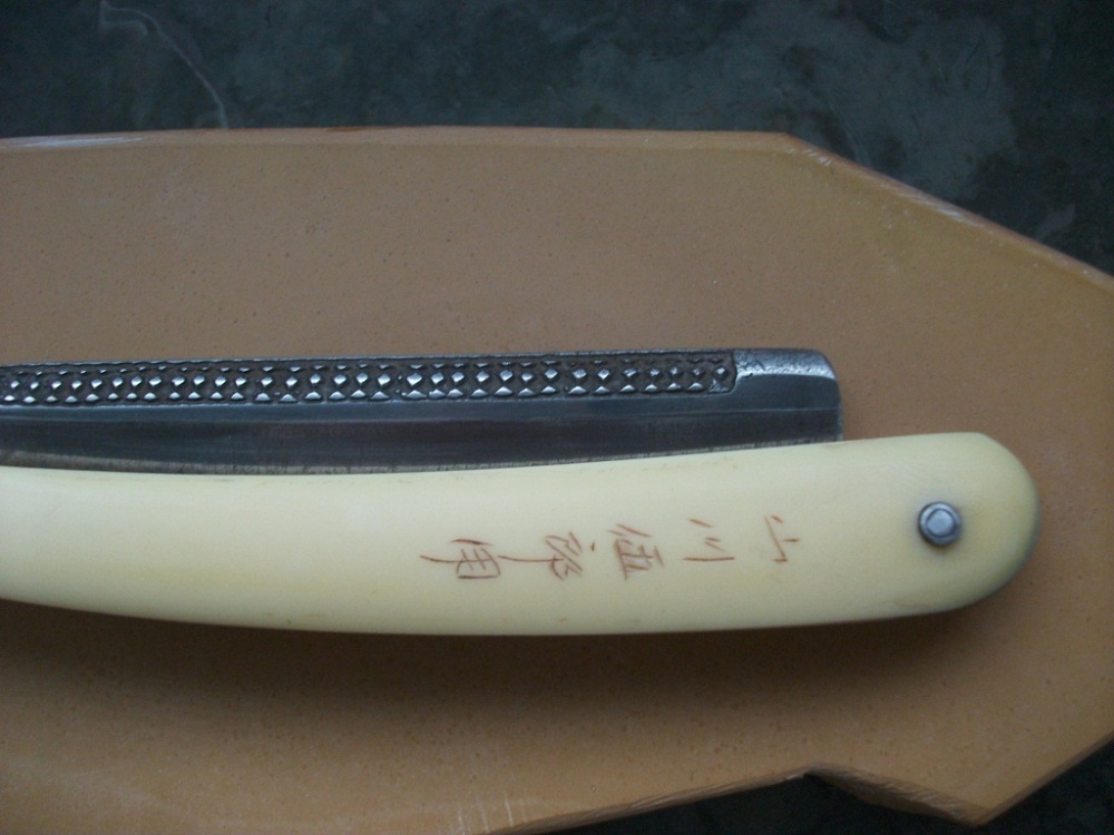 А на рукоятке скорее всего владелец выцарапал своё имя и фамилию. Определить, что там написано будет сложновато.. Челябинские мужики настолько суровы, что правят бритву не на ремне, а на роже.