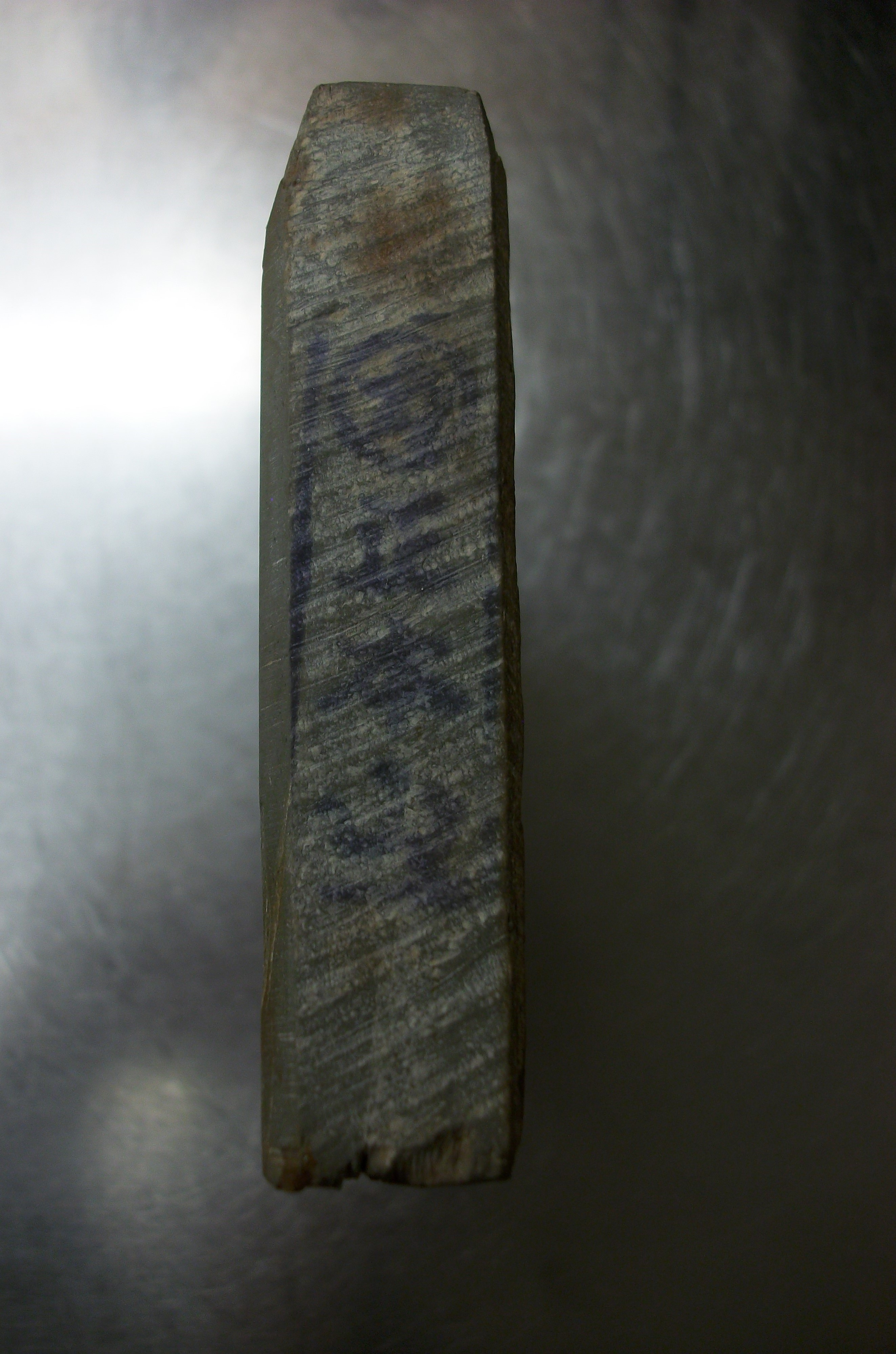 Re: Помогите определить каменьИ от меня на опознание: нечто вроде старого оселка в кожаном чехольчике, камень не твердый, легко царапается ножом, с продольным рисунком, воду впитывает слабо, суспензия белёсая. Размер 140х30х13