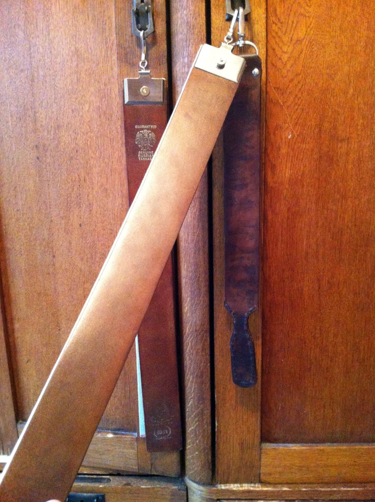 У американца кожа более жесткая, и требует небольшой полировки, продавец сказал, что финишировал на 2500 наждачке, но небольшие шероховатости местами остались. А вот немец изумителен. До недавнего времени, моим фаворитом среди ремней, был собственноручно изготовленный из куска очень старой телячьей кожи ( лет пятьдесят пролежал на подволоке (чердаке) старинного брошенного дома в моей деревне.) Этим летом кусок был отмочен, вымыт, порезан на заготовки (вышло к сожалению только две) пропитан ланолином и обработан наждачкой от 300 до 2500, на финише выглажен стеклянной банкой. Сделал два ремня, колодочный и подвесной. Так вот, подвесной превосходил все мной доселе испробованное, и очень мне нравился. Недостатком была только его небольшая длина рабочей части (30 см), и пожалуй избыточная жесткость ( кожа все-таки старая очень, чего говорить). Однако, 15-30 проходов, и даже сильно затупленная бритва начинала резать волос в 5-8 мм от пальцев (волос тонкий, корень зажат в пальцах). Сегодня, побрившись, решил проверить новый ремень (который немецкий). Бритва тяжелый клин от Joseph Elliot, 7\8. После 10 кругов бритва начала резать волос зажатый корнем в пальцах, более чем в сантиметре. Я потрясен! Да и пользоваться ремешком одно удовольствие, он очень эластичный, гладкий, бритва движется очень плавно по нему ( на моем все-таки малость скачет порой). Bart und Mantel machen den Philosophen nicht.