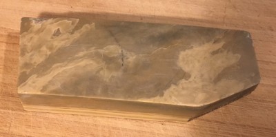 Re: Такие разные бельгийские гранатовые сланцы. LyapaDara спасибо за иформацию. Но камень не был в использовании так как видны были распилы от дисковой пилы. Торцы камня похожи на обычный BBW с перламутровым переливом. От работы бритвы суспензия не вырабатывается, приходится подымать её более твёрдым камнем. Для этого использую основу на которую приклеен котикул. Что за камень не знаю, тоже какой то сланец тёмно серого (почти чёрного) оттенка с более тёмными пятнами. Котикул тоже новодел продают маленькими кусочками произвольной формы как нагуру. Я сначала думал что может быть просто слой BBW вырезали не вдоль пласта а поперёк, но и с торцов камень твёрдый. Сначала растроился что камень какой то не такой, а теперь когда его немного по мучал доволен так как его можно использовать с разными "нагурками" так и чистым. Не плохо работает на жидком мыле разбавленным водой. На масле не так быстро, но тоже не плохо.