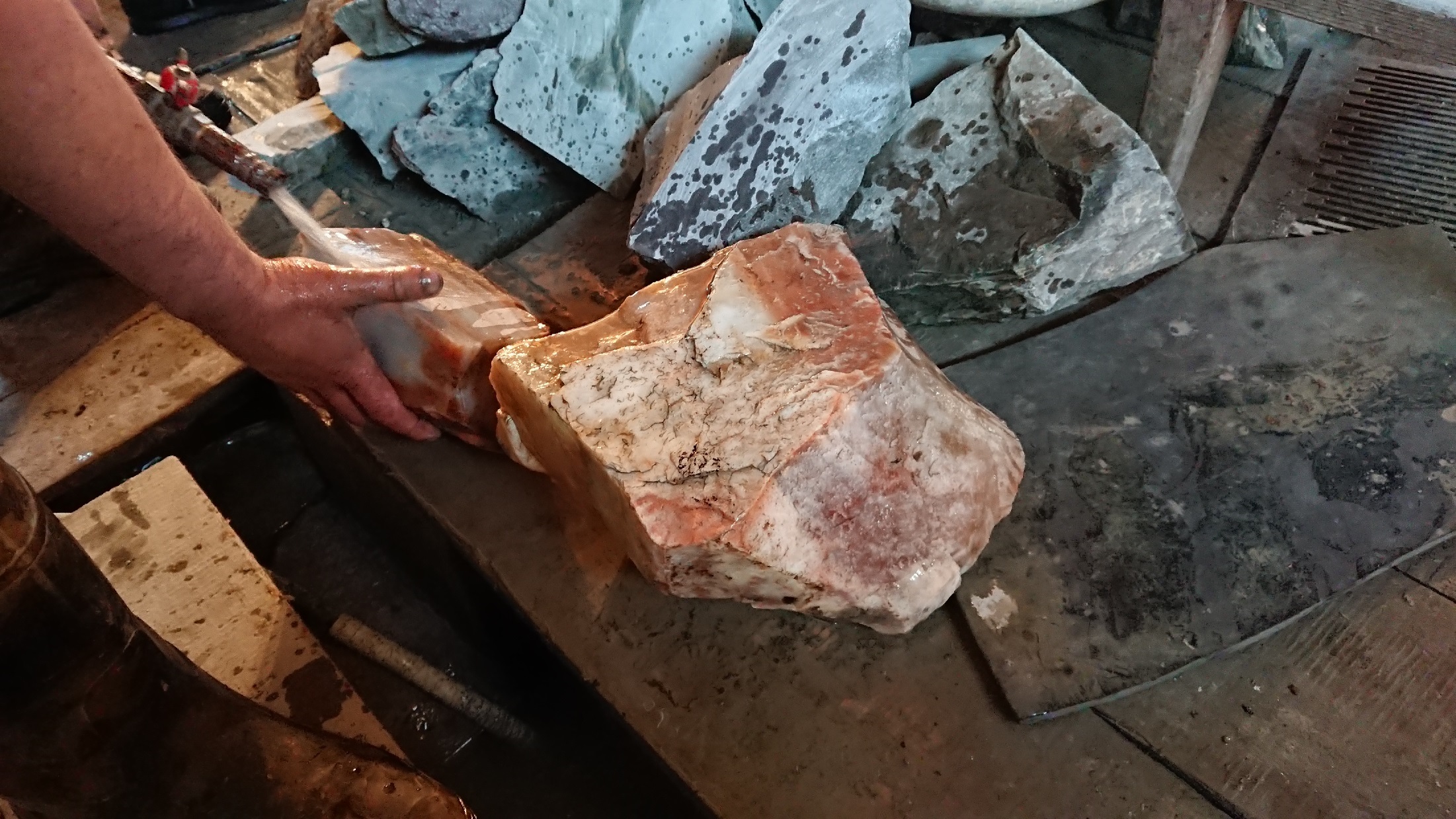 Цвет варьируется от белого до кроваво-красного с синими прожилками. Разделяются по плотности - чем глубже порода, тем плотнее и прозрачнее. На фото - первый камень из опытной партии из Южного карьера. На первый взгляд трудно отличить от Т-арканзаса.