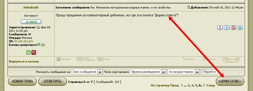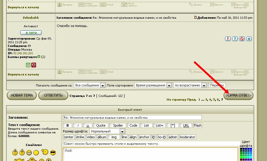 Re: Японские натуральные водные камни, и их свойстваЯ разобрался в чем дело. Заходите в личный раздел, личные настройки, настройки отображения, и ставите «да» на: « Показывать панель быстрого ответа в темах:» Далее подтверждаете настройки, делаете обновление страницы. Все, кнопка в правом нижнем углу, где и подобает ей быть. Хлопаете дружно в ладоши.