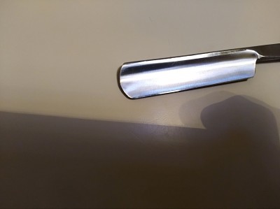 Тем не менее на стекле бритва с обеих сторон лежит абсолютно идеально. Если смотреть сверху, то все тоже ровно, только ближе к носику есть незначительное сужение. Бреет плохо, не дерет как тупая, но словно финиш закончен максимум тысячах на шести.