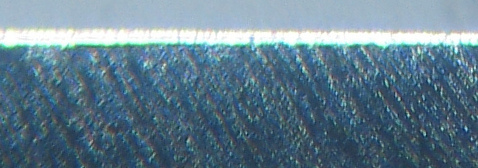 Кто не знает как смотреть при 600 крат и менее остриё, и реснички - это его личные проблемы. Видели люди имеющие электронный микроскоп, кто захочет найдёт снимки в гуглах. Что это? Это структура железа на острие. А заусенец - вытяжение полосы железа, которое никогда не появится при правильной заточке и которое зачастую видно невооруженным глазом. Не надо эти понятия путать. Где там какие реснички? А вот снимок оптическим микроскопом острия бритвы: А вы думали на кожаном ремне за пару движений затачивается РК просто?