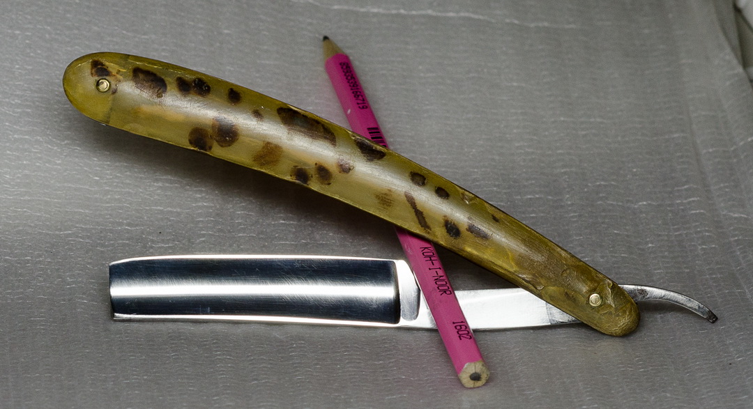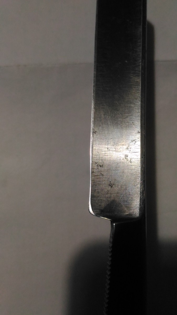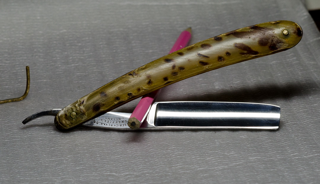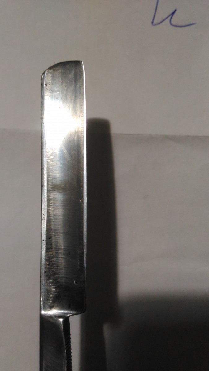 Прошу помочь консультацией по той самой самостоятельной заточке. Ситуация такая: достался мне клин (на фото). Старый, заслуженный, но вполне себе замечательный. Щербины от ржавчины глубокие, ну да не мешают. В общем, при попытке заточить нарвался на интересное явление: одна сторона точится хорошо, но другая имеет какой-то разрыв в геометрии. (Фото). Я думал, что, может удар был или еще что-то вроде - но нет, промерил штангелем, толщина одинаковая. Под этим разрывом возникло место, которое не протачивается. Что можно сделать с этим и как бороться? (Ради интереса: если заняться возвращением к жизни этой бритвы, т.е. регринд (иначе, я так понимаю, каверны не убрать), ручка, заточка - во сколько это может вылиться?) Добавлено спустя 20 минут 10 секунд: Сразу еще поинтересуюсь. Вот такой, как на фото Frederick Reynolds Sheffitld мне пока не по зубам. Я его, стыдно сказать, наточить не могу. (Камень SUEHIRO, 1000; кромка выводится, при проверке на ногте никакой сыпи не чувствуется - а не режет волос, и все.) Как я не пробовал - пока результата нет. Ну, ладно пока потренируюсь на старых СТИЗах, еще поучусь, а вот этого англичанина реанимировать можно ли?