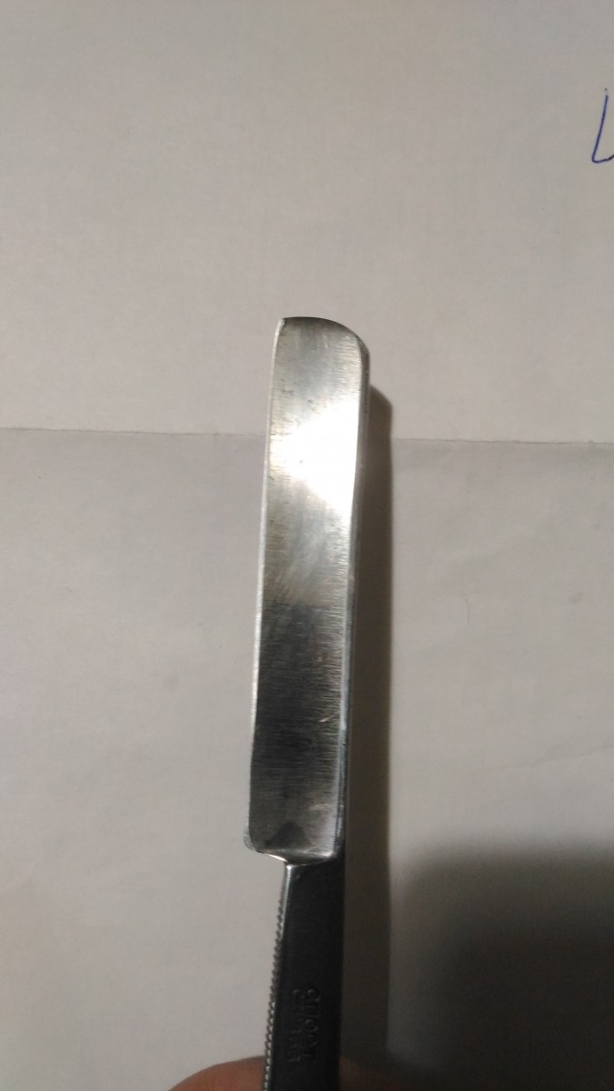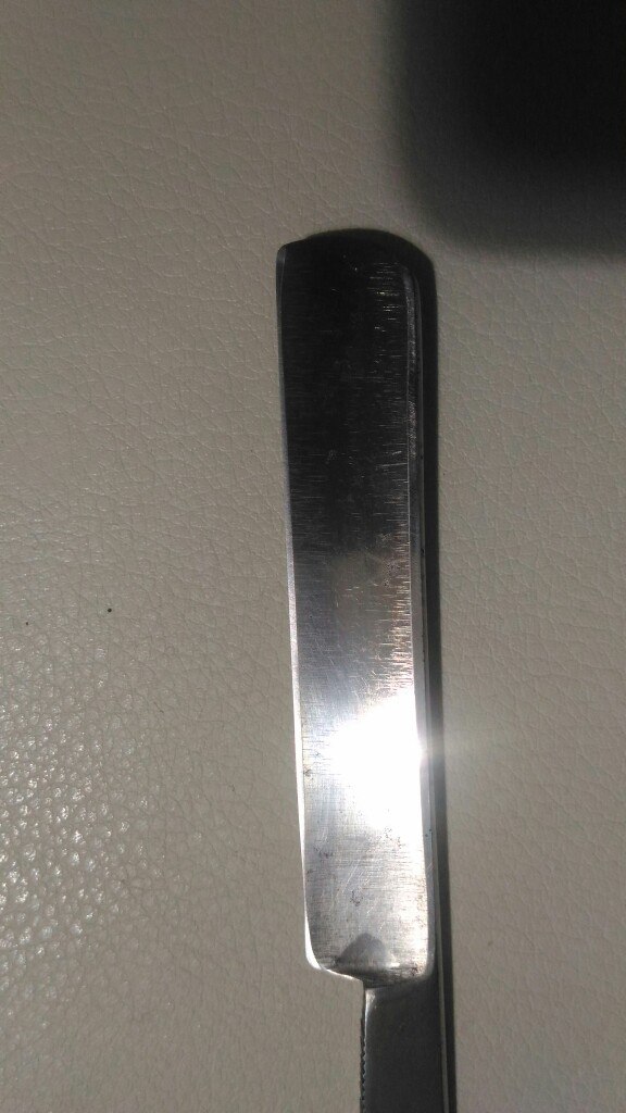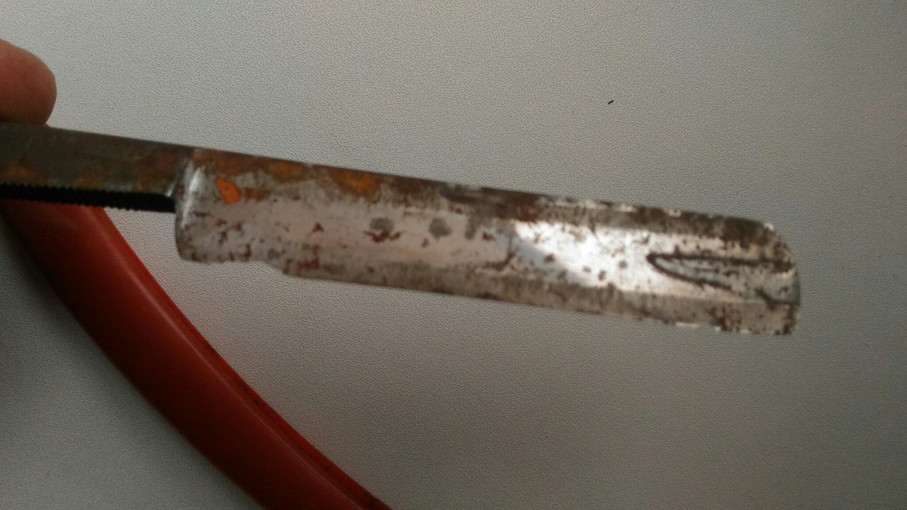 Найдена в гараже вот такой СТИЗ Спорт 56 г Сточил дефекти снизу и почистил Попробовал заточить: бреет с носка и с пятки, серединка не бреет вообще. Подумал, что не до конца свел кромку, решил снять еще побольше металла. На этот раз начал с наждачки 1000 и до 2500, дальше на камнях, ремень. Итог тот же - середина клинка не бреет, по краям бреет. Что это может быть и что с этим делать?