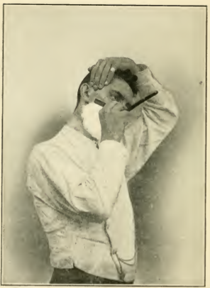 After completing the first pass, you should put the razor down and rinse the face with hot water from the sink. Then re-lather just as you did for the first pass. The second, acrossthe grain pass,requires a little more care, and you will know if your razor isn’t sharp enough at this point; it will pull if it isn’t. Assuming itis, proceed with the second pass. Try to lead with the point a little - ifthe razorisslightly oblique to the direction oftravel each hair will meetthe blade at an angle which allows it to slide to the side a tiny bit, and thus the blade cutsit more easily asitslides along the edge in a tiny slicing action. Ifthe razor seems to catch, don’t keep on pushing it through, but lower the spine a little closer to the skin and then proceed. Here is the sequence for going acrossthe direction of hair growth on my face:Notice how I am going upwards on the sides of my neck; this is because the hair grows laterally here, so this is actually across the grain. Where the hair grows downwards underthe chin,the razoris moved acrossit.Once again, put down the razor and rinse and re-lather. The final passrequires a very lighttouch, and you must be aware ofwhatthe edge is doing at alltimes. Don’t daydream, or you will be cut. Remember to drop the spine if it seems to be catching; never push on through. Again lead with the point - the pictures show what I mean by this. The trickiest part of the face is under the chin, and with most of the hair gone in the first two passes this part should be easy on the third. I will be going against the direction of hair growth in these pictures, so the razor travels sideways towards the midline on my neck, upwards under the chin and on the face itself. On the upper lip I don’t go directly against the grain, but obliquely upwards. Here itis:Notice the oblique upwards stroke on the upperlip.There are bound to be a few tiny nicks after your first shave this way, so after the third pass put down the razor and splash very cold water onto your face to rinse off the remaining lather. The cold water will constrict blood vessels, and halt most tiny nicks from bleeding. A styptic pencil should be at hand for touching on those that aren’tstopped.Thisstingsfor a moment butworkswell. You will very rarely need it at all once you have the hang of it! Then pat yourface drywith a towel.Rinse out your brush in coldwater, and squeeze itto get most ofthewater out. Flick it vigorously to get out the rest. Either hang the brush up in a stand, or simply stand it uprightif you have faith in yourscience lessons and understand that capillary action will keep the water remaining from sinking down into the knot of the brush. Rinse the razor under the hot tap being very careful to avoid touching the edge against the tap or the sink. A ding of this kind is a major repair on a straight razor and you aren’t ready to undertake that just yet! It doesn’t mattertoo much whether you strop the razor now, orjust before the nextshave.You did it! Hopefully you are still in one piece and not too weak at the knees. Next, we have to finish up with some soothing balm to ensure your skin forgives you for dragging a razor overit.