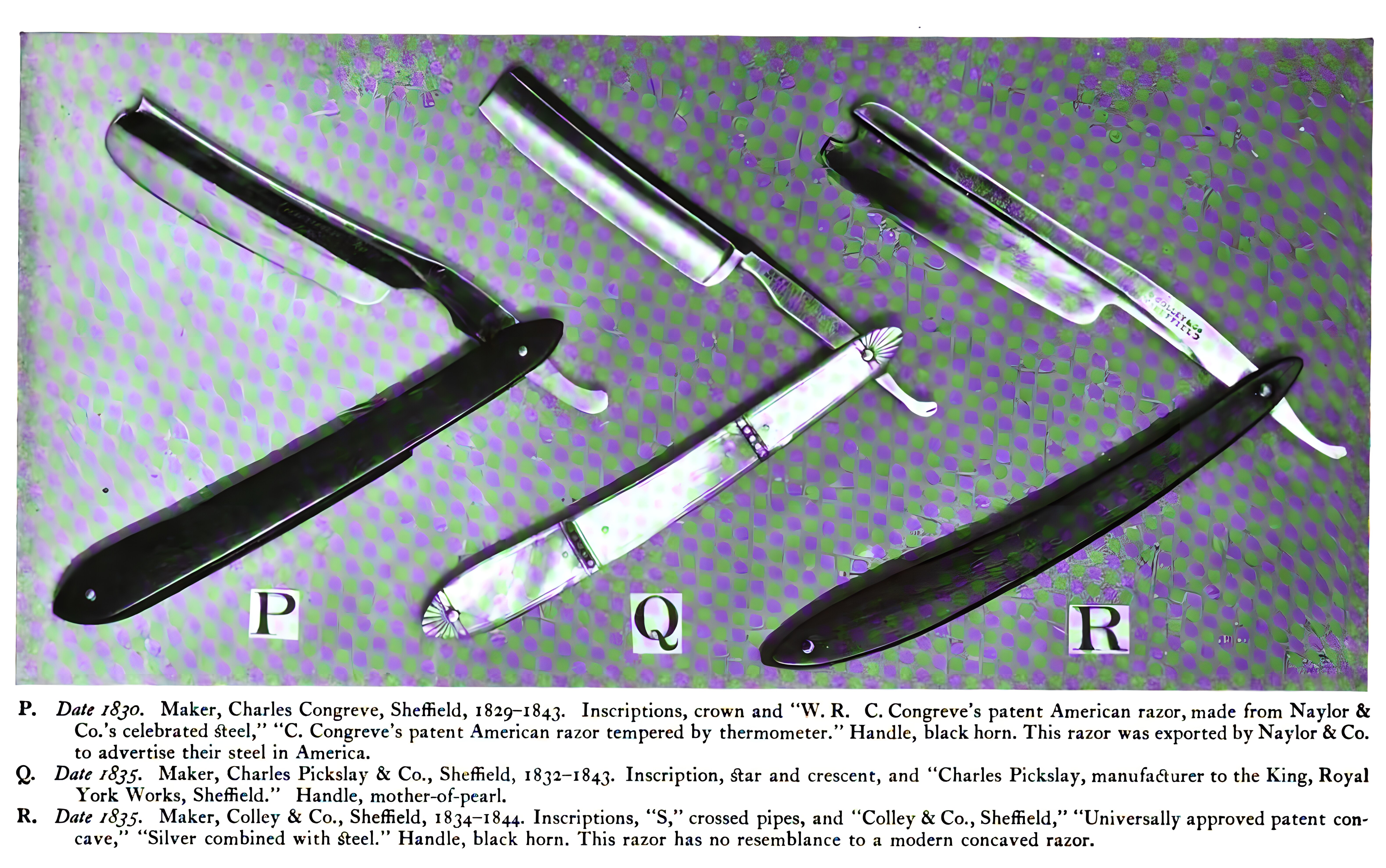 - P. Дата 1830 г. Производитель,Charles Congreve, Шеффилд, 1829–1843 гг. Надписи: корона и «W. R. Патентованная американская бритва C. Congreve, сделанная из знаменитой стали Naylor & Co.», « Патентованная американская бритва C. Congreve, закаленная c применением термометра». Ручка: черный рог. Эта бритва была экспортирована компанией Naylor & Co. для рекламы своей стали в Америке.