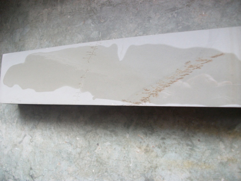Суспензия молочно белая, есть включения, но они не чувствуются, возможно со стороны наклейки их нет, еще толком не притер. Цвет определить трудно, светло серый, но когда мокрый, то отдает зеленью.