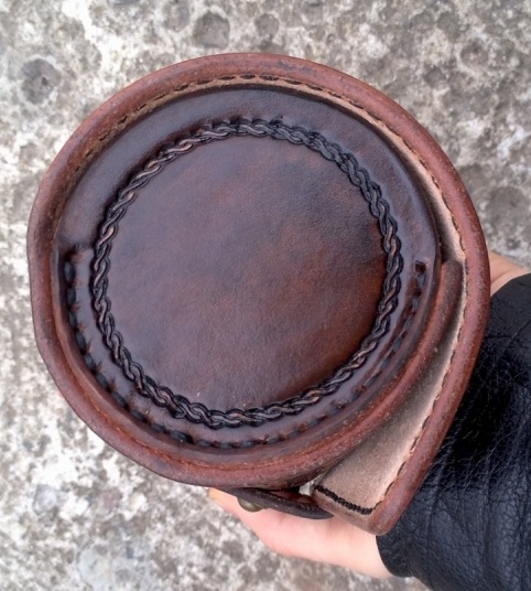 Фляга ок. 1 л, нержавейка СССР, стенки толстые, прокладка под крышкой задубенела и развалилась потому ее заменил на кожаную, пропитанную пчелиным воском. Тиснением сделан солнечный крест.