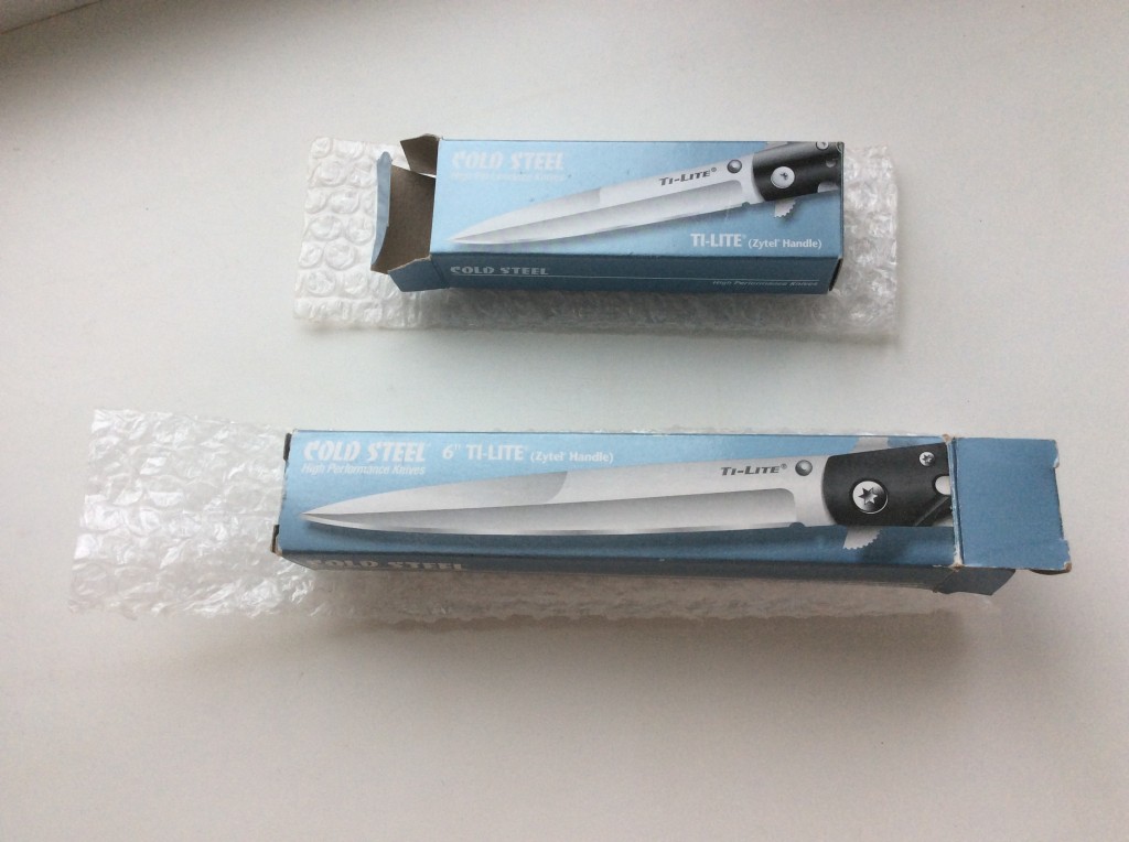 Обменяю ножи из своей коллекцииТЕМА ЗАКРЫТА. Добрый вечер уважаемые форумчане. Предлагаю на обмен харизматичный оригинальный нож ТI-Lite 6 от известной американской фирмы COLD STEEL. Сталь японская AUS 8A, материал рукоятки Zytel. Более подробную информацию можно найти в интернете. Нож абсолютно не пользованный, заточка родная. Нож в отличном состоянии, без царапин и потёртостей. К ножу прилагается сертификат. Обмен на старый английский клин 7/8 в приятном состоянии. Сделаю доплату. МАЛЕНЬКИЙ НОЖ ОТПРАВИЛСЯ К НОВОМУ ВЛАДЕЛЬЦУ.
