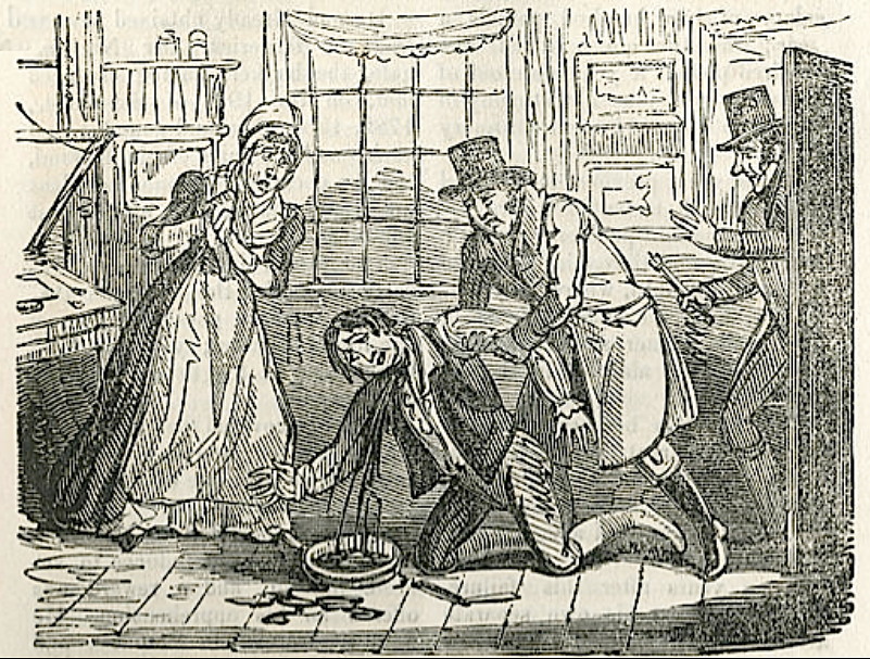 Иллюстрация из Ньюгетского календаря (англ. The Newgate Calendar) или Ньюгетского справочника, - книжное издание в шести томах, которое включало в себя биографии преступников, в своё время отбывавших наказание в Ньюгетской тюрьме в период с конца XVIII по XIX век. Справочник также содержал описания преступлений, чем активно пользовались сыщики.
