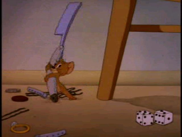 Сегодня рассказали, что смотрели с утра "Том и Джерри" и в одной из серий сценка - "тётка вываливает вещи на пол - там опасная бритва. Мышонок берёт бритву и срезает ножки у стула, на котором сидит тётка."Номер и название серии неизвестно. Но кто найдёт - просьба выложить, или хотя бы инфу о серии...