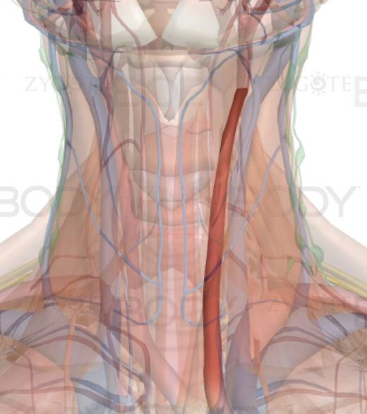 Спец наз резать вообще не обучают, т.к. эффективность стремится к нулю, это только в кино так делают. Все мышцы удалены, вид сзади сбоку, сонная артерия прилегает прямо к трахеи изнутри