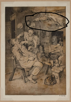 Боссе, Абрахам, дизайнер. Леблон, Жан Пер, редактор Между 1632 и 1633 годами Табличка 6 из серии из семи пластин под названием «Профессии». Буква — на лицевой стороне в центре черными чернилами напечатано: «le Blond excud auec Priuilege». Штамп — на лицевой стороне внизу по центру фиолетовыми чернилами: «VILLE / DE / PARIS» (см. приложение Lugt, 2012c). Штамп - На лицевой стороне внизу по центру черными чернилами: «CARNAVALET» (Lugt 432d). Знак коллекционера — на оборотной стороне в центре красными чернилами: «COLLECTION / GAILHABAUD». Инвентарный номер - спереди справа внизу черными чернилами и сзади слева внизу: «RG: 123». Интерьерная сцена. Парикмахер завивает мужчине усы с помощью утюга после того, как он побрился. Кувшин с водой и посуда для бритья стоят у изножья кровати. Парикмахеру помогает молодой подмастерье, который готовит и передает различные принадлежности, необходимые для этого туалета (щетки, расчески, ножницы и щипцы для завивки, нагретые в небольшой печке, поставленной на столе). На стене справа висит картина, изображающая миф о Данае. Гобелены. Обрамление свитками листвы. Мода 17 века. Мебель 17 века. Городской пейзаж за окном. Музей Карнавале