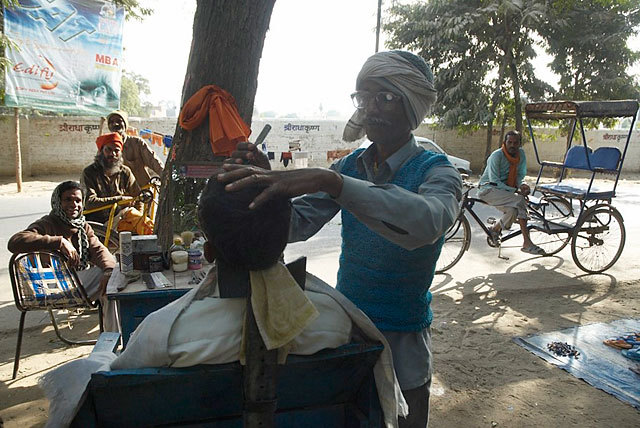 Re: Интересные фотоЧто бы как то разрядить обстановку. В Индии повсеместно встречаются уличные парикмахеры и брадобреи. Вешают зеркало на улице прямо на заборе и ставят стул. Клиент садится и его бреют опасной бритвой. Этот же сидел прямо на краю дороги в центре города.