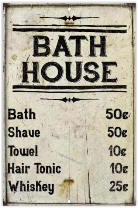 Vicky J. Rose написала, что „За пресную воду в ванне ковбой, вероятно, заплатил бы 50 центов, но если бы он был готов искупаться в использованной воде, цена могла бы упасть до 25 центов”. Я в этом не верю, но вероятно в связи с этим, за около 20 долларов в интернете продаются шутливые сувенирные вывески, с подобными надписями: Но все таки, это напоминает мне как принимают японскую домашную ванну „фуро”. Вот в чем дело. Традиционно, несколько членов семьи принимают ванну один за другим в одной и той же воде. Хотя, прежде чем войти в „фуро”, люди тщательно моются с мылом, находясь вне ванны. Может быть, поэтому, не всем японцам нравиться делить ванну даже с членами своей семьи. Как-то в одной из американских газет (Лос-Анджелес Таймс) рассказывалось о „фуро” и одна семнадцатилетняя японка в своем интервью сказала, что ей не нравится принимать ванну после своего отца, так как он сильно потеет !? С 2013 г. с кайфом бреюсь опасной бритвой пять раз в неделю, в три прохода.