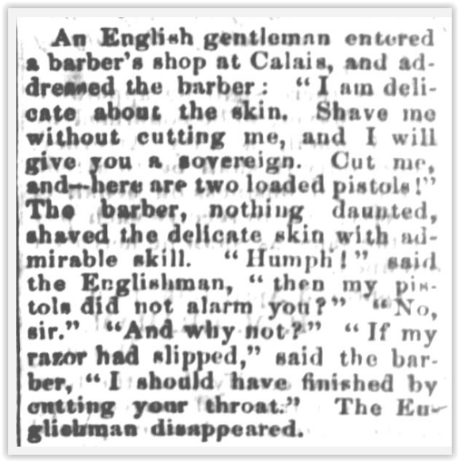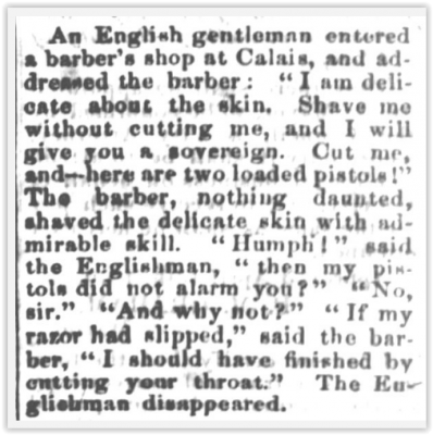 Вот анекдот того времени из американской газеты, штат Канзас, 1870 г. Английский джентльмен вошел в парикмахерскую в Кале (город во Франция) и обратился к парикмахеру: „Я деликатен в отношении кожи. Побрей меня, не порезав, и я дам тебе соверен (золотая монета). Порежь меня и вот два заряженных пистолета!” Цирюльник, ничто не смущаясь, с удивительным мастерством сбрил нежную кожу. "Хм!" - сказал англичанин, - значит, мои пистолеты вас не тревожили? "Нет, сэр." "И почему бы нет?" „Если бы моя бритва поскользнулась, - сказал парикмахер, - я бы закончил, перерезав тебе горло”. Англичанин смотался. Вот анекдот в оригинале: С 2013 г. с кайфом бреюсь опасной бритвой пять раз в неделю, в три прохода.