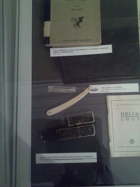 Подлинная бритва, которой Ленин брился, представлена в экспозиции. Сохранился рисунок М. Шафрана «Ленин в Разливе», здесь Ленин как раз изображен без бороды. На рисунке нет второго участника описываемых событий Григория Зиновьева, который и у Аллилуевых в квартире, и в Разливе скрывался вместе с Лениным.