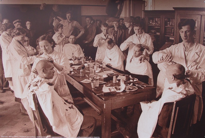 Первые дни войны, мобилизация. В парикмахерской мобилизационного пункта. Москва, 1941 го