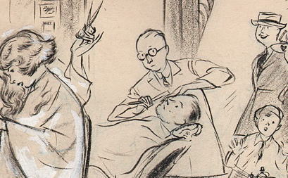 Опасная бритва в искусстве (картины, рисунки, фото, тату)Нервно выглядящего мужчину собирается побрить улыбающийся парикмахер, держащий в руке бритву. Из книги Джеймса Барра (James Barr) «Американский юмор - избранный» с введением и указателем американских юмористов. Иллюстрации Ч. Э. Брока (James Barr)». Опубликовано в 1893 году компанией Walter Scott Ltd, Лондон.