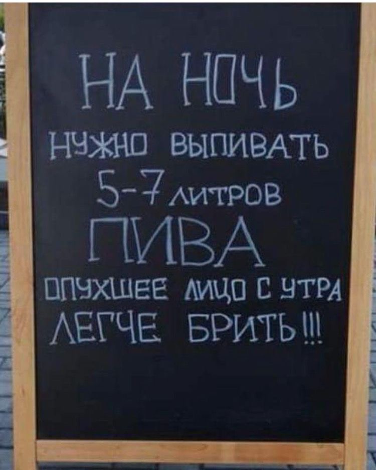 Добавлено спустя 8 минут 56 секунд: Два друга думали что подарить своему коллеге по работе на день рождения. — Подарим бритву. — Нет бритва у него уже есть. — Тогда фотоаппарат. — Нет это у него тоже есть. И так далее. Недоумевают — все у него есть. Тут видят плакат: — КНИГА — ЛУЧШИЙ ПОДАРОК. — О! Подарим книгу! — говорит первый. — Нет, — безнадежно отвечает второй. Книга у него тоже есть. Не знаю был или нет, да и бритва тут косвенно... Добавлено спустя 1 минуту 18 секунд: — Вдумайтесь во фразу из рекламы: — Теперь бритва бреет с меньшим раздражением… Я так и знал, что количество порезов напрямую зависит от настроения бритвы! Ремонт опасных бритв, звонить с 11-00 до 23-00, +79267729357, (whats app, telegram, VK), спросить Олега.