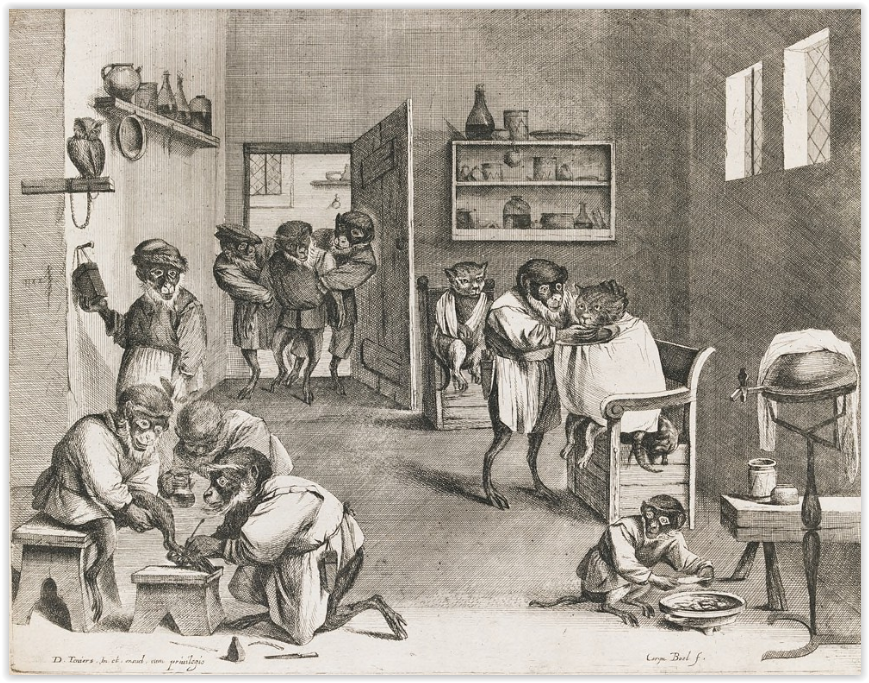 Самое интересное заключается в том, что Корин Боэль сделал эту гравюру после Давида Тенирса Младшего, чью картину „Обезьяны в цирюльне” я уже показывал. Вот ее еще раз, чтобы ты сравнил обе картинки и увидел как Корин Боэль ее доработал и "развернул".