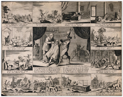 На большой гравюре в центре изображена парикмахерская, которую уже видели. Вокруг нее двенадцать меньших гравюр, каждыя снизу с двумя стихами, по-разному представляют бегство или безответственность сторожевого пса - аллегория поведения некоторых государств Европы.