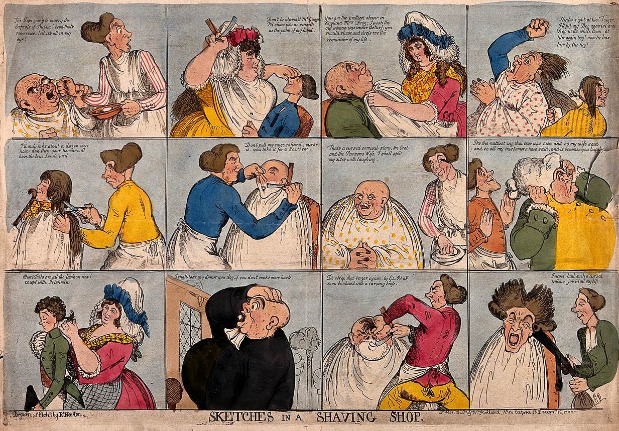 Newton drew in a loose, caricatural style which already reminds modern-day observers of a comic strip. His work 'Sketches In A Shaving Shop' (1794) is notable for showing 12 images in three rows of four, ridiculing men who want their facial hairs trimmed. Each image has handwritten sentences floating above the characters' heads to indicate what they are saying. A similar work is 'Samples Of Sweethearts and Wives' (1795), which mocks drunk women in eight panels, accompanied by handwritten text above their tipsy faces. Both satirical works shares a resemblance with comics, but don't follow a real narrative. They are basically a series of humorous incidents built around one comical premise, but involving different characters. Кому не лень - сделайте нормальный перевод, я в английском дуб... Ремонт опасных бритв, звонить с 11-00 до 23-00, +79267729357, (whats app, telegram, VK), спросить Олега.