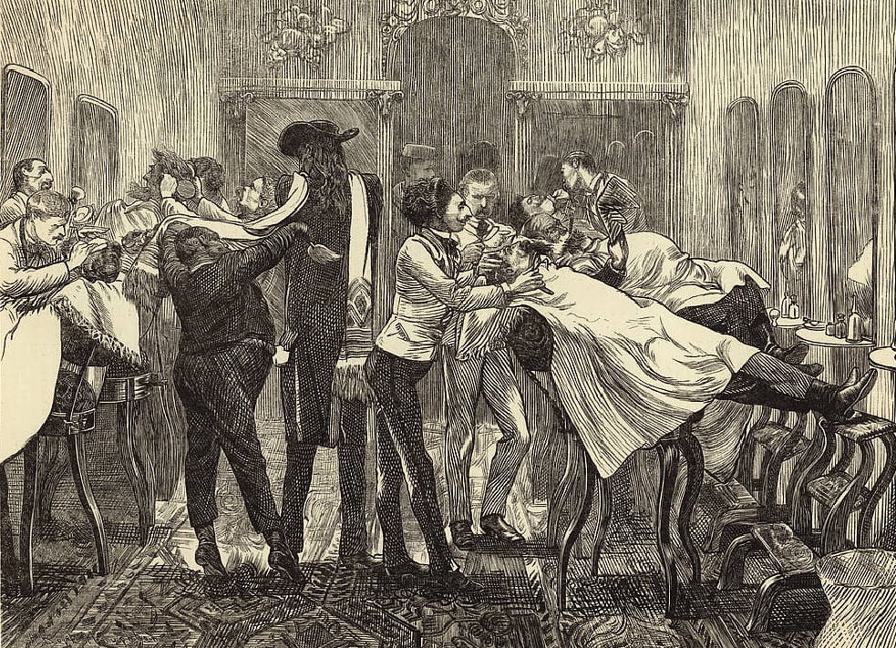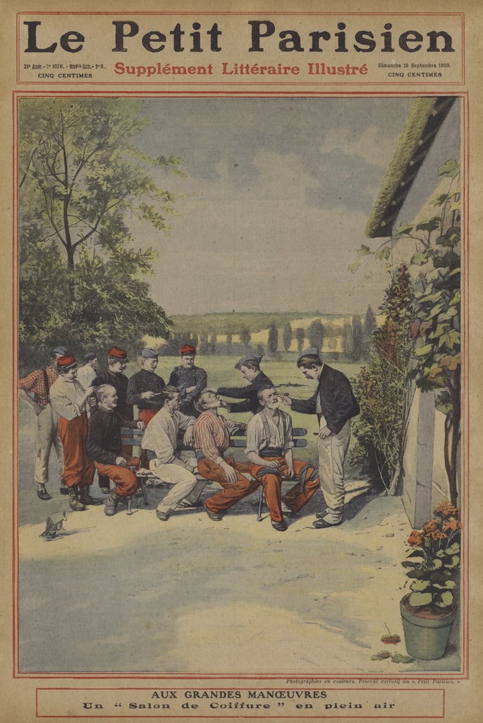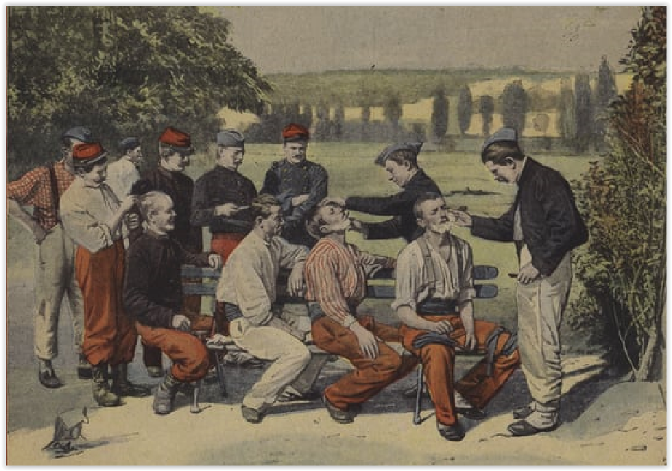 „Grand manoeuvres of the French Army: an open air barber's” „Большие маневры французской армии: парикмахерская под открытым небом” Взглянем поближе: С 2013 г. с кайфом бреюсь опасной бритвой пять раз в неделю, в три прохода.
