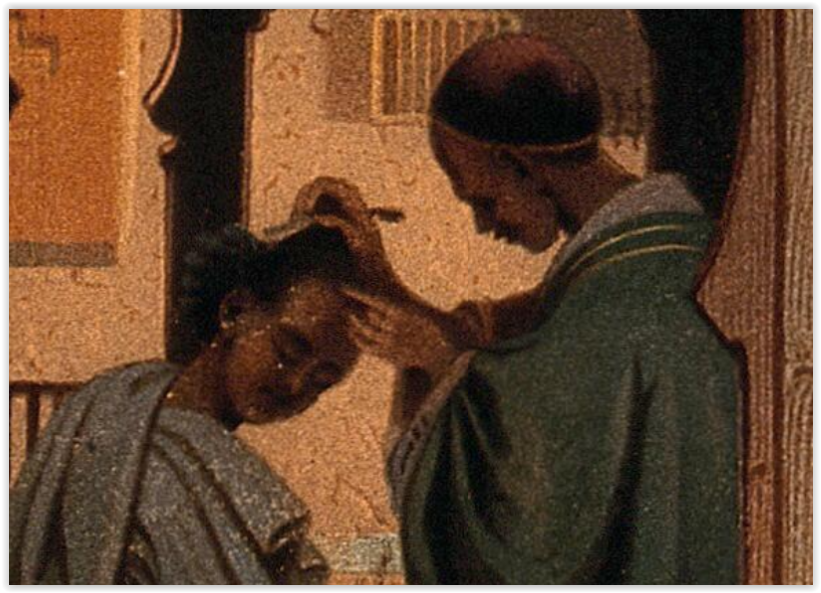 „Barbershop in Achmim” „Цирюльня в Ахмиме” Взглянем поближе: С 2013 г. с кайфом бреюсь опасной бритвой пять раз в неделю, в три прохода.