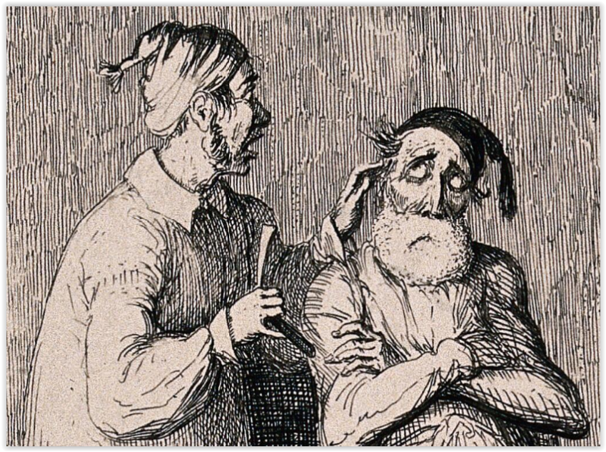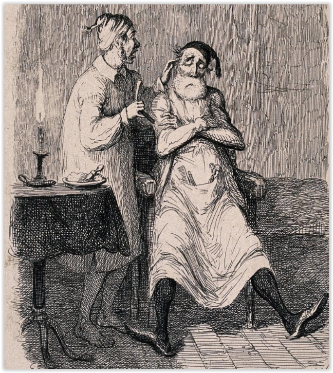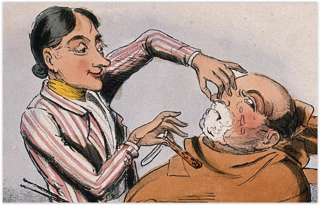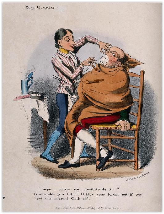 „A barber shaving a large man draped in a sheet” „Парикмахер бреет крупного мужчину, закутанного в простыню” 1838 г. Взглянем поближе: Надпись гласит: „Merry thoughts: I hope I shave you comfortable sir? Comfortable you villain? I'l blow your brains out if ever I get this infernal cloth off”. „Веселые мысли: Надеюсь, вам удобно, сэр? Комфортно тебе негодяй? Я взорву тебе мозги, когда сниму эту простыню”.