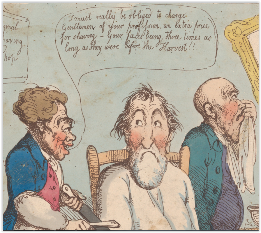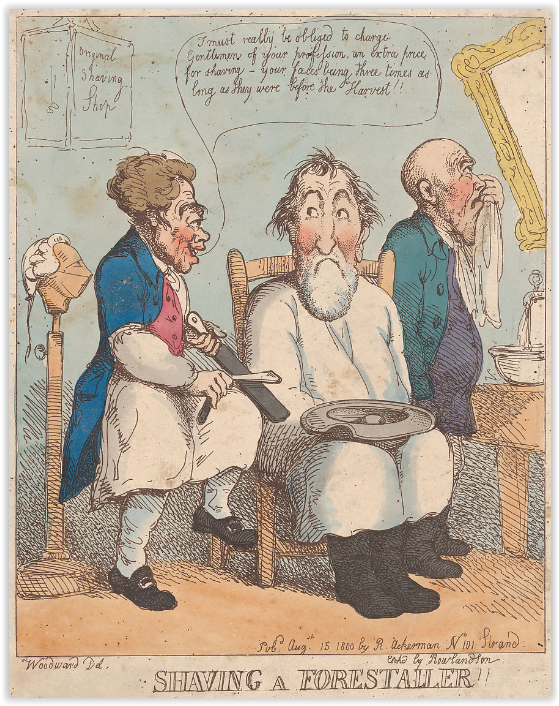 и Thomas Rowlandson (1757-1827) Томас Роулендсон - английский художник, карикатурист и книжный иллюстратор. „Shaving a Forestaller” „Бритье лесоруба”, 15 август 1800 г. Надпись гласит: Цирюльник саркастически шутит: „Я действительно вынужден взимать с джентльменов вашей профессии дополнительную плату за бритье - ваши лица в три раза длиннее, чем они были до начало рубки леса!”. То есть, у лесоруба изхудалое лицо с провалившимися щеками, что затрудняет процесс бритья.