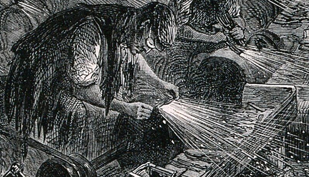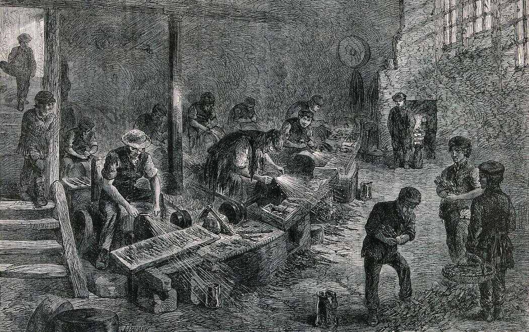 John Palmer (даты рождения и смерти неизвестны). Джон Палмер - английский иллюстратор и гравер, работал в периоде 1856-1887 гг. Его гравюра была опубликована в „The illustrated London news”, 1866 г. „Men and boys working in a grinding factory in Sheffield” „Мужчины и мальчики, работающие на шлифовальных станках на заводе в Шеффилде”. Большинство из них шлифуют вилки, но в центре картины мужчина шлифует бритв. Он шлифует бритву, а на полочке перед ним лежат еще: Покажу ещё поближе: С 2013 г. с кайфом бреюсь опасной бритвой пять раз в неделю, в три прохода.