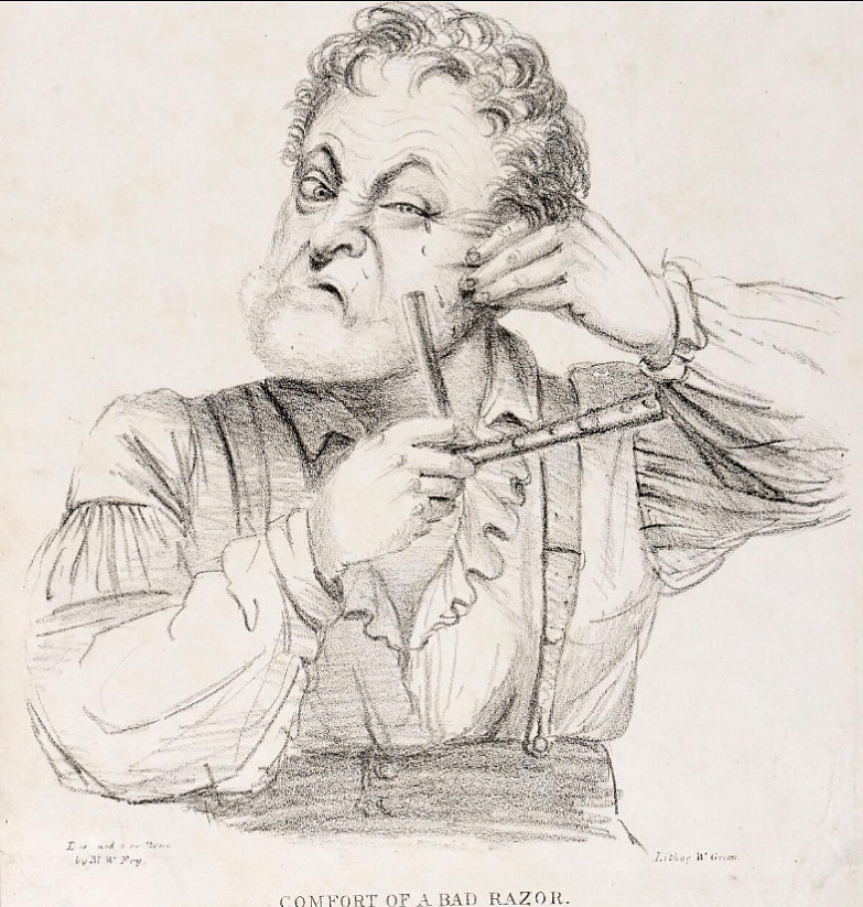 „Comfort of a bad razor” „Комфорт плохой бритвы” ок. 1827 г. Слезы на глазах и порезы на щеках … (стихи о тупой бритвы С 2013 г. с кайфом бреюсь опасной бритвой пять раз в неделю, в три прохода.
