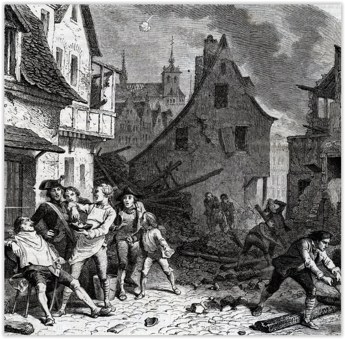 Я просто долго ищу картинки с разных источников. Иногда мне везет и в течение одного-двух часов удается найти пару штук, а иногда - ничего нового. Вот, сегодня нашел еще одну. Gustave DuCourdray (1838-1906) Гюстав ДюКурдре - французский историк и педагог. В 1885 г. вышла его книга „Cent Récits d'Histoire Contemporaine” (Сто рассказов новейшей истории). Вот иллюстрации из этой книги. Художник неизвестный. „Bombardment of Lille 1792 in a French-Austrian War” „Бомбардировка города Лилля 1792 года во время франко-австрийской войны”. Цирюльник Маес использует кусок бомбы в качестве миски для пены, чтобы побрить четырнадцать граждан посреди улицы из щебня. Про цирюльника Маес я уже показывал картин: viewtopic.php?p=232208#p232208