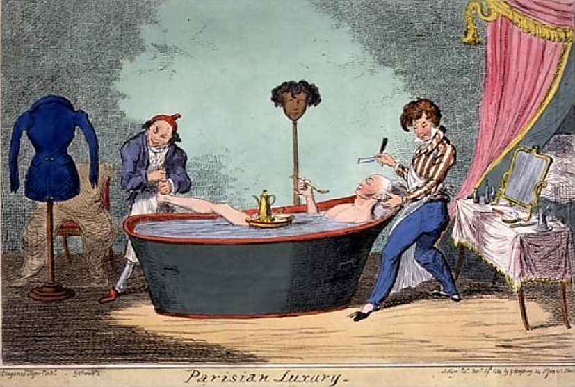 „Parisian Luxury. A Parisian gentleman takes a bath attended by his barber and manicurist”. „Парижская роскошь. Парижский джентльмен принимает ванну в сопровождении своего цирюльника и мастера по маникюру” ок.1824 г. С 2013 г. с кайфом бреюсь опасной бритвой пять раз в неделю, в три прохода.