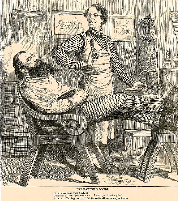„The barbers logic” „Логика парикмахера” 1877 г. Парикмахер: - Побрить голову, сэр? Клиент: - Что ты имеешь в виду. Я хочу, чтобы ты остриг мне волосы. Парикмахер: - О, прошу прощения. Но ведь на самом деле все равно. Бритва здоровенная: С 2013 г. с кайфом бреюсь опасной бритвой пять раз в неделю, в три прохода.