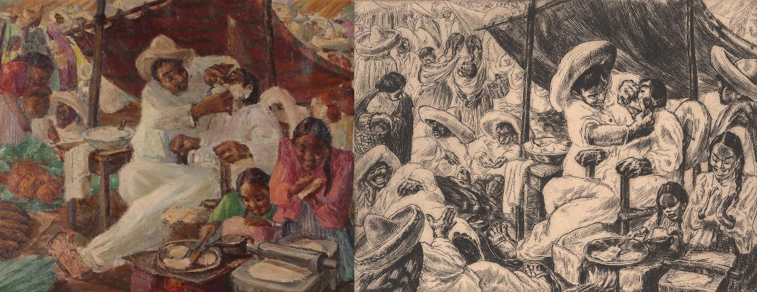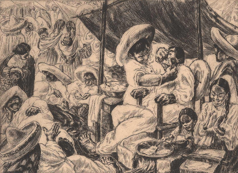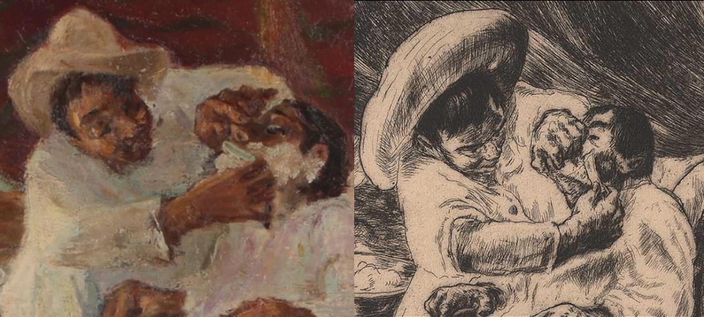Гравюра „Mexican Barber Shop” „Мексиканская цирюльня” Раньше я показывал его подобную картину маслом, и если их сравнить, увидим, что между ними есть более двадцати различии: форма бритвы, положение рук цирюльника, меняется количество людей и др. А так лучше просматриваются различия: С 2013 г. с кайфом бреюсь опасной бритвой пять раз в неделю, в три прохода.