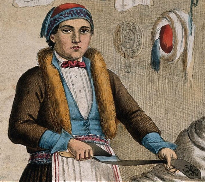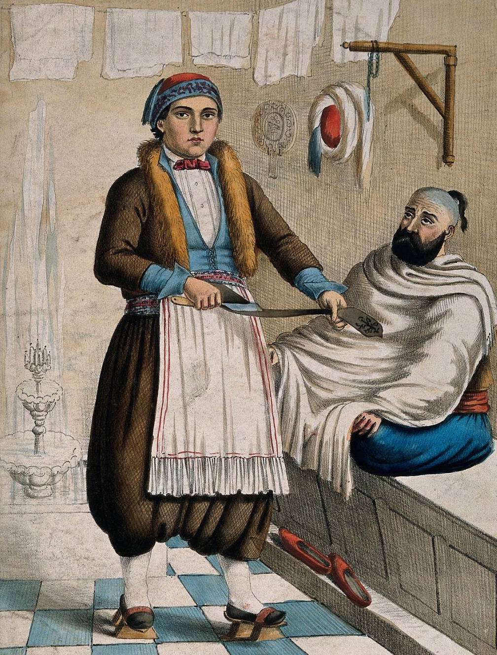 В 1863 г. в Париже вышла его книга „Les Anciens Costumes De l'Empire Ottoman Depuis L'Origine De La Monarchie Jusqu'A La Reforme du Sultan Mahmoud” („Древние костюмы Османской империи от зарождения монархии до реформации султана Махмуда”) Вот иллюстрация из этой книги: „Un barbier en costume national aiguise son rasoir” „Цирюльник в национальном костюме править бритву”. Впервые вижу такой способ крепления подвесного ремня - на поясе! С 2013 г. с кайфом бреюсь опасной бритвой пять раз в неделю, в три прохода.