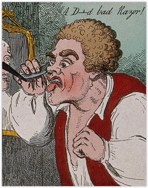 „A damned bad razor” „Чертовски плохая бритва” 1796 г. (Морда красная, хват особый). С 2013 г. с кайфом бреюсь опасной бритвой пять раз в неделю, в три прохода.