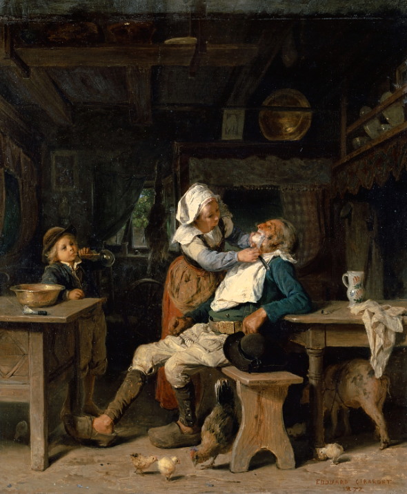 Опасная бритва в искусстве (картины, рисунки, фото, тату)Да, бриться грациозными движениями. Edouard Henri Girardet (1819-1880) Эдуард Анри Жирарде - французский художник и гравер швейцарского происхождения (Swiss-born artist). Учился в Ecole des Beaux-Arts, Paris (Школа изящных искусств, Париж). „A Barber’s Shop In Brittany” „ Цирюльня в Бретани” 1872 г. Это одна из самых реалистичных картин, из всех, которых я видел. Посмотрите, бритва бросает полоску света на лице девушки! Взглянем поближе: