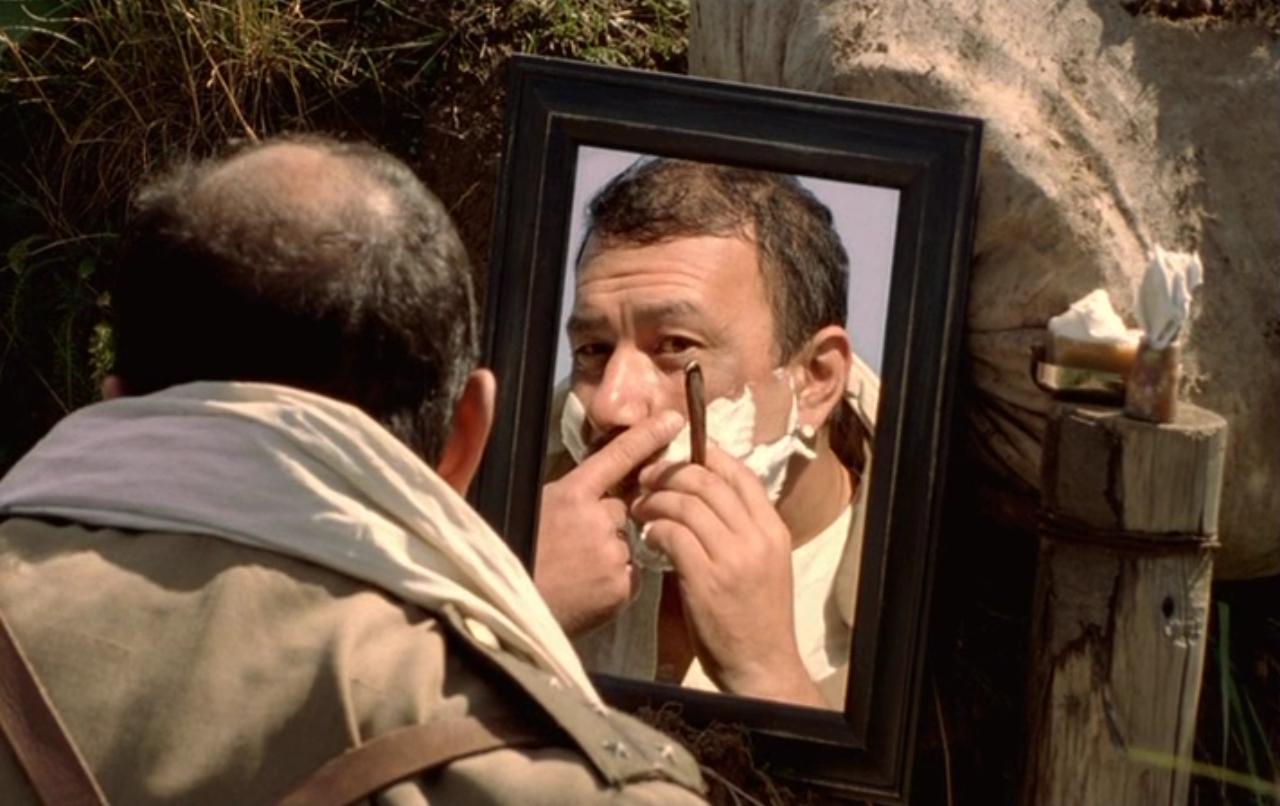 Re: Фильмы с участием опасной бритвы"Иисус. Бог и человек". Режиссер Роджер Янг, 1999 год. Бритье, а точнее- подбривание бородки Понтия Пилата (в исполнении Гарри Олдмена) римской бронзовой бритвой с использованием такого же зеркала.